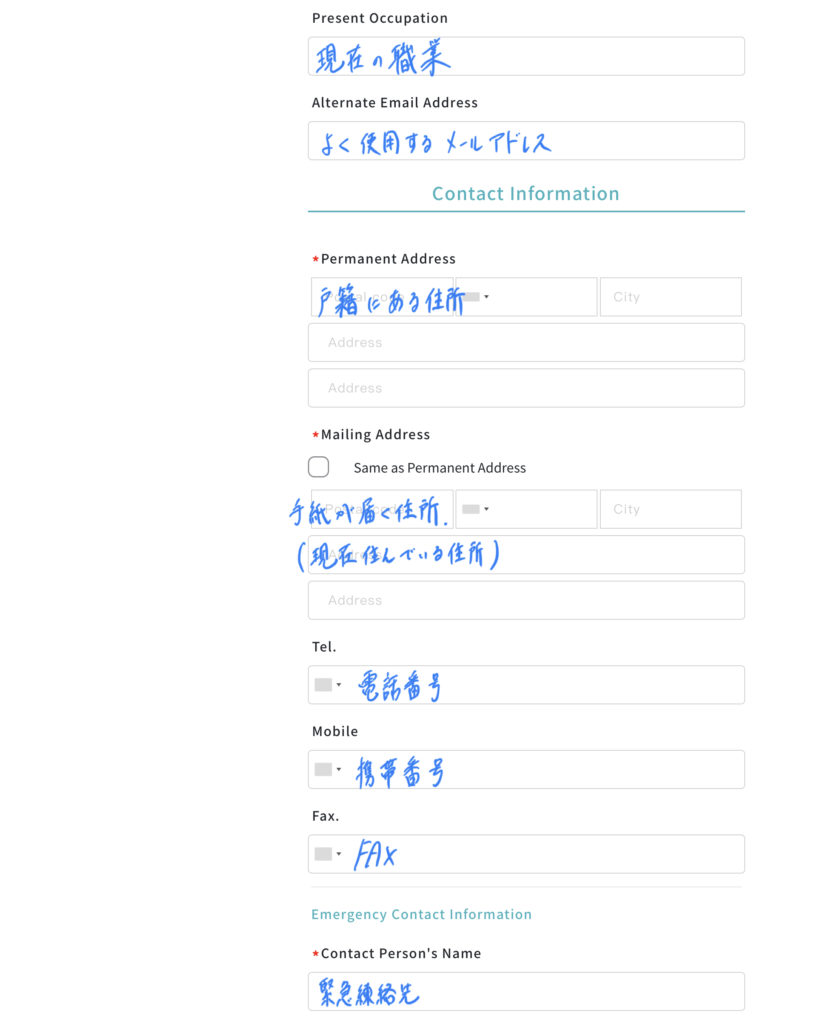 ただ、学生や社会人の方で、実家とは別のところに住んでいるという方は、permanent addressの方には戸籍上の住所を、mailling addressの方には今住んでいる住所(手紙が受け取れる住所)を書く必要があります。