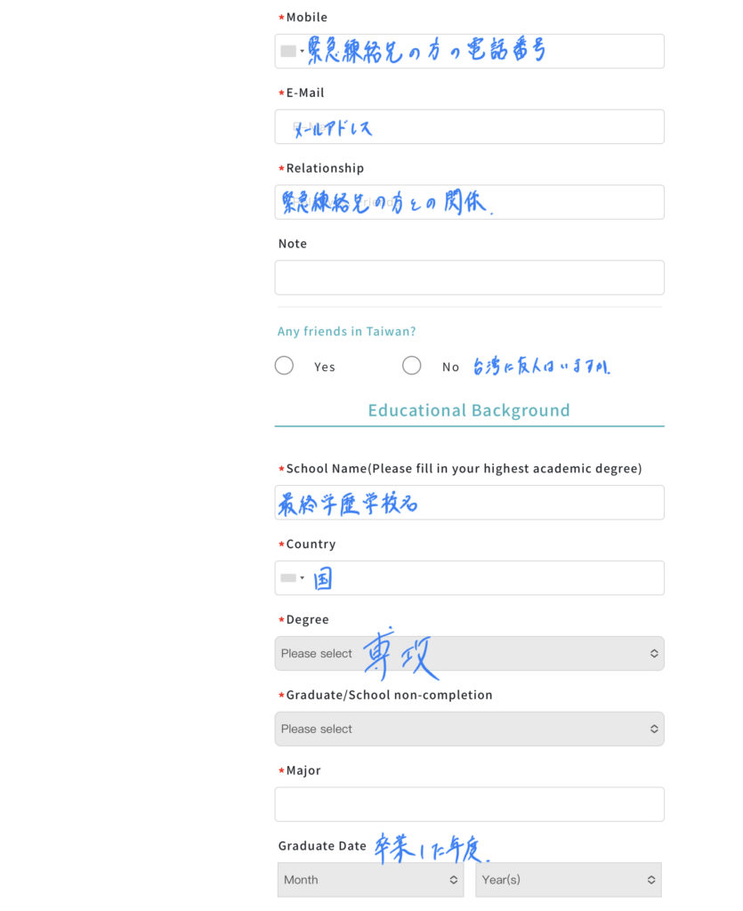 台湾に友人はいますかという欄において、私たちに連絡をいただければいつでもどこでも(流石に遠すぎるところは無理ですが…)駆けつける心意気ではあります。お気軽にご連絡ください。